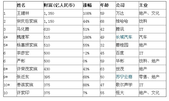 前5名中有3個(gè)首次進(jìn)入前五:42歲的馬化騰排名第三;49歲的“黑馬”汽車大王魏建軍排名第四,財(cái)富在過去兩年漲了7倍;32歲的楊惠妍排名第五,成為今年的中國女首富。前5名平均財(cái)富比去年翻了一番。