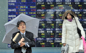圖為日本首都東京街頭,人們走過股市信息顯示牌!⌒氯A/法新 |