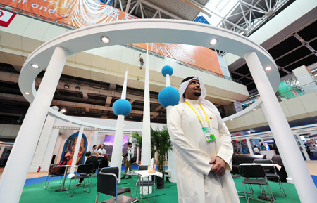 圖為當(dāng)天展會(huì)現(xiàn)場(chǎng),一位科威特參展商正在科威特展館前等待觀展者。