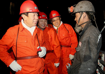 神華集團(tuán)公司董事長(zhǎng)張喜武在井下檢查煤炭安全生產(chǎn)!≠Y料照片 |