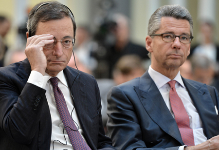 歐洲央行行長德拉吉(左)16日在德國柏林出席“歐洲與歐元——家庭事務(wù)”主題活動。德拉吉在發(fā)言時呼吁歐元區(qū)各國出臺更多刺激性政策推動企業(yè)投資,以此創(chuàng)造就業(yè)機會并提升歐元區(qū)整體競爭力。