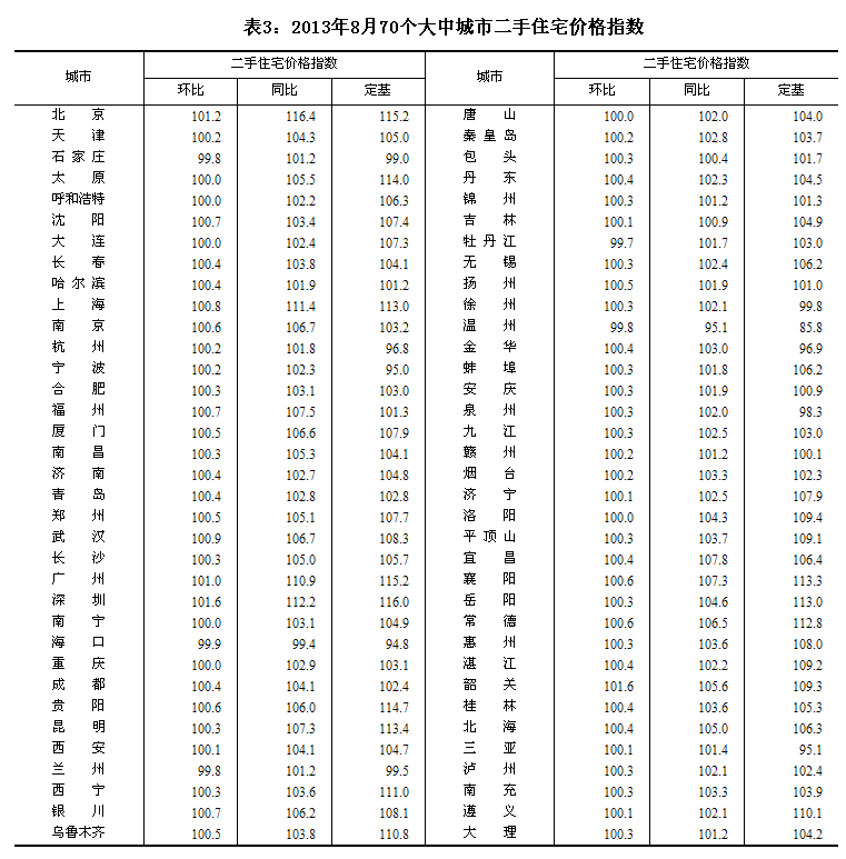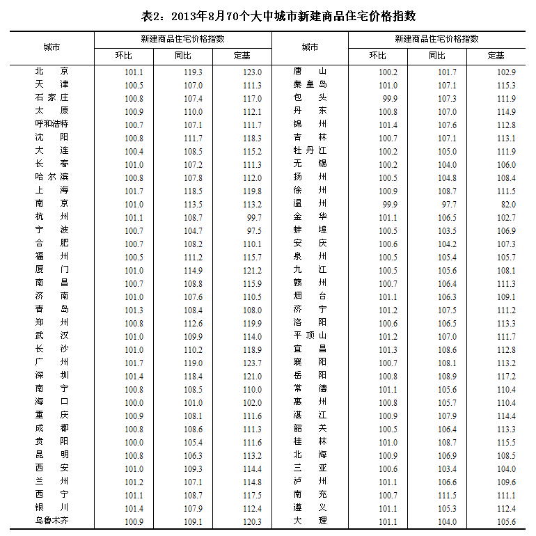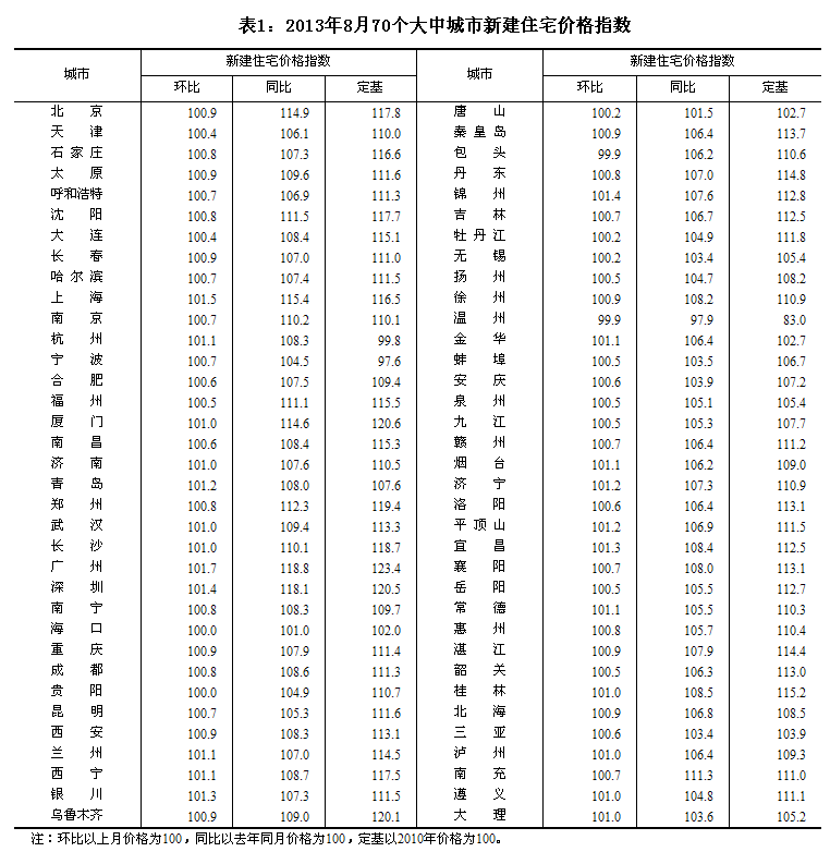 國(guó)家統(tǒng)計(jì)局9月18日公布2013年8月份70個(gè)大中城市住宅銷(xiāo)售價(jià)格變動(dòng)情況,與上月相比,70個(gè)大中城市中,新建商品住宅(不含保障性住房)價(jià)格下降的城市有2個(gè),持平的城市有2個(gè),上漲的城市有66個(gè)。環(huán)比價(jià)格變動(dòng)中,上海漲幅最高,為1.7%,溫州和包頭最低,下降0.1%。與去年同月相比,70個(gè)大中城市中,新建商品住宅(不含保障性住房)價(jià)格下降的城市有1個(gè),上漲的城市有69個(gè)。8月份,同比價(jià)格變動(dòng)中,北京漲幅最高,為19.3%,僅溫州下降,降幅為2.3%。