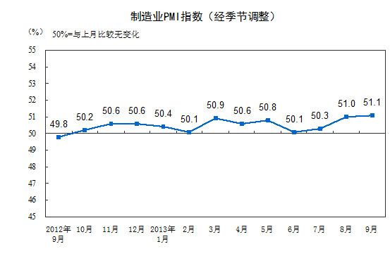 2013年9月,構(gòu)成制造業(yè)PMI的5個(gè)分類(lèi)指數(shù)4升1降。