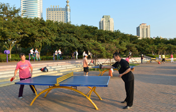 市南區(qū)的居民在休閑廣場(chǎng)健身運(yùn)動(dòng)。 |