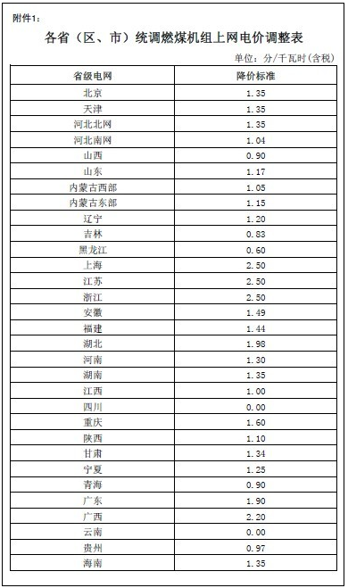 一、降低有關。▍^(qū)、市)燃煤發(fā)電企業(yè)脫硫標桿上網(wǎng)電價,具體降價標準見附件1。各地未執(zhí)行標桿電價的統(tǒng)調燃煤發(fā)電企業(yè)上網(wǎng)電價同步下調。