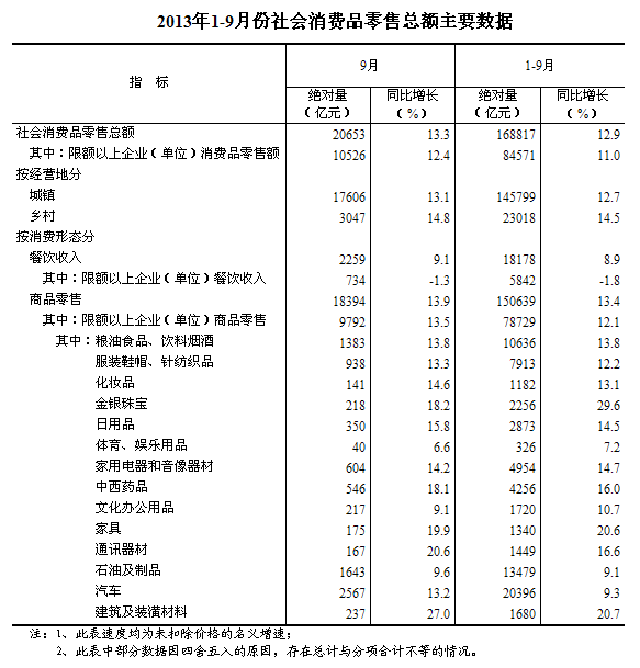 國家統(tǒng)計(jì)局18日發(fā)布數(shù)據(jù),2013年9月份,社會(huì)消費(fèi)品零售總額20653億元,同比名義增長13.3%(扣除價(jià)格因素實(shí)際增長11.2%,以下除特殊說明外均為名義增長)。其中,限額以上企業(yè)(單位)消費(fèi)品零售額10526億元,增長12.4%。1-9月份,社會(huì)消費(fèi)品零售總額168817億元,同比增長12.9%。