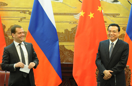 10月22日,中國(guó)國(guó)務(wù)院總理李克強(qiáng)在北京人民大會(huì)堂與俄羅斯總理梅德韋杰夫共同簽署《中俄總理第十八次定期會(huì)晤聯(lián)合公報(bào)》,提出采取切實(shí)措施促進(jìn)雙邊貿(mào)易額增長(zhǎng),到2015年達(dá)到1000億美元,到2020年達(dá)到2000億美元,同時(shí)加強(qiáng)在相互提供出口信貸、保險(xiǎn)、項(xiàng)目融資和使用銀行卡等領(lǐng)域內(nèi)的合作。圖為李克強(qiáng)在北京人民大會(huì)堂與梅德韋杰夫共同會(huì)見(jiàn)記者。
