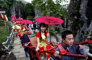 “滑竿抬幺妹”,是華鎣山區(qū)人民的傳統(tǒng)習(xí)俗,已有1250多年歷史。早在唐代,在每年六月觀音菩薩得道日子前后,華鎣山區(qū)都要舉行“滑竿抬幺妹”比賽,年輕的漢子將漂亮的幺妹抬上華鎣山,拜佛觀景,漢子與幺妹相中后,就結(jié)為秦晉之緣,白頭到老!
