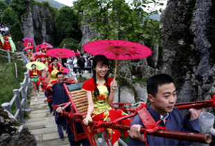 | “滑竿抬幺妹”,是華鎣山區(qū)人民的傳統(tǒng)習(xí)俗,已有1250多年歷史。早在唐代,在每年六月觀音菩薩得道日子前后,華鎣山區(qū)都要舉行“滑竿抬幺妹”比賽,年輕的漢子將漂亮的幺妹抬上華鎣山,拜佛觀景,漢子與幺妹相中后,就結(jié)為秦晉之緣,白頭到老。