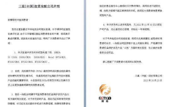 在過去的兩天時間里,央視財經(jīng)頻道《經(jīng)濟(jì)半小時》欄目連續(xù)播出了三星部分型號手機(jī),涉嫌設(shè)計缺陷導(dǎo)致頻繁死機(jī),以及三星公司在維修售后服務(wù)環(huán)節(jié),對中國消費者進(jìn)行不公正待遇的報道,節(jié)目播出后,引起了社會各界的巨大反響,今天下午三點半,三星公司正式通過央視財經(jīng)頻道向中國消費者的致歉及企業(yè)整改聲明。