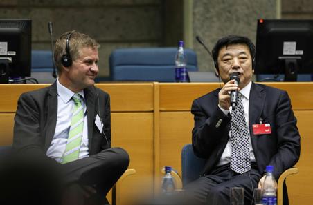 10月28日,中國(guó)石化總裁李春光(右)在領(lǐng)導(dǎo)力圓桌會(huì)議上回答提問(wèn)。新華社記者孟晨光攝