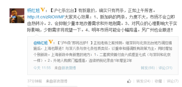 他在微博中分析道,1、新加碼的兩條,力度不大,市場(chǎng)不會(huì)立即由熱轉(zhuǎn)冷。2、會(huì)抑制少量本地改善需求和外地剛需。3、對(duì)民眾的心理影響大于實(shí)際影響,少數(shù)需求將觀望一下。4、明年市場(chǎng)可能會(huì)小幅降溫。另廣州也會(huì)跟進(jìn)!