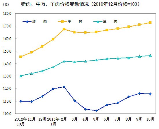 2013年10月份,全國(guó)居民消費(fèi)價(jià)格總水平同比上漲3.2%。其中,城市上漲3.2%,農(nóng)村上漲3.3%;食品價(jià)格上漲6.5%,非食品價(jià)格上漲1.6%;消費(fèi)品價(jià)格上漲3.2%,服務(wù)價(jià)格上漲3.1%。1-10月平均,全國(guó)居民消費(fèi)價(jià)格總水平比去年同期上漲2.6%。