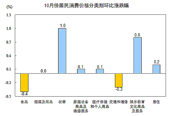 10月份,非食品價(jià)格環(huán)比上漲0.3%。其中,衣著、娛樂(lè)教育文化用品及服務(wù)、居住、家庭設(shè)備用品及維修服務(wù)、醫(yī)療保健和個(gè)人用品價(jià)格分別上漲1.0%、0.8%、0.2%、0.1%和0.1%,交通和通信價(jià)格下降0.3%,煙酒及用品價(jià)格持平。