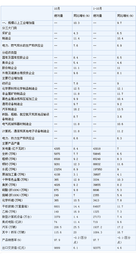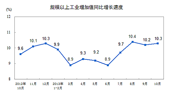 2013年10月份,規(guī)模以上工業(yè)增加值同比實(shí)際增長10.3%(以下增加值增速均為扣除價(jià)格因素的實(shí)際增長率),比9月份加快0.1個(gè)百分點(diǎn)。從環(huán)比看,10月份,規(guī)模以上工業(yè)增加值比上月增長0.86%。1-10月,規(guī)模以上工業(yè)增加值同比增長9.7%。