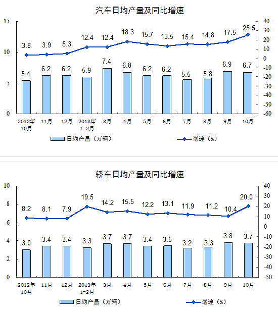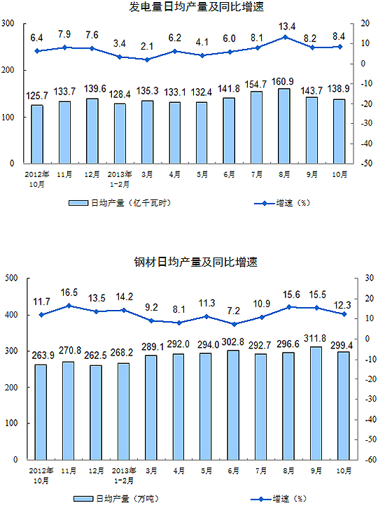 分產(chǎn)品看,10月份,464種產(chǎn)品中有328種產(chǎn)品同比增長。其中,發(fā)電量4305億千瓦時(shí),同比增長8.4%;鋼材9281萬噸,增長12.3%;水泥23254萬噸,增長8.9%;原油加工量4108萬噸,增長3.1%;十種有色金屬365萬噸,增長12.9%;乙烯149萬噸,增長16.9%;汽車208.5萬輛,增長25.5%;轎車115.6萬輛,增長20.0%。
