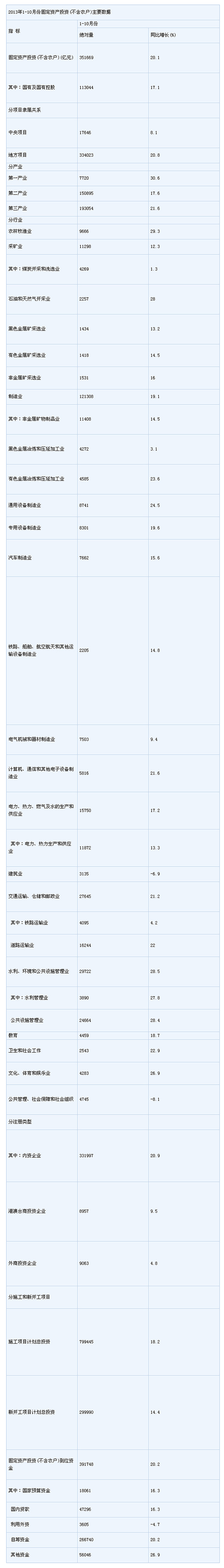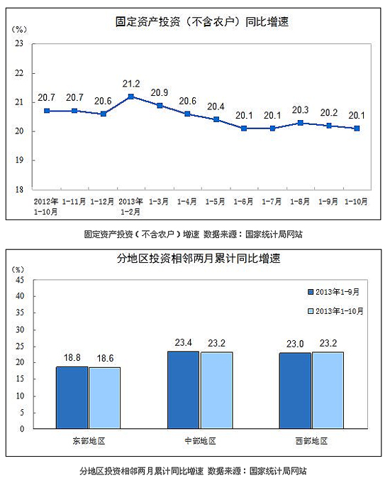 2013年1-10月份,全國固定資產投資(不含農戶)351669億元,同比名義增長20.1%,增速比1-9月份回落0.1個百分點。從環(huán)比看,10月份固定資產投資(不含農戶)增長1.43%。