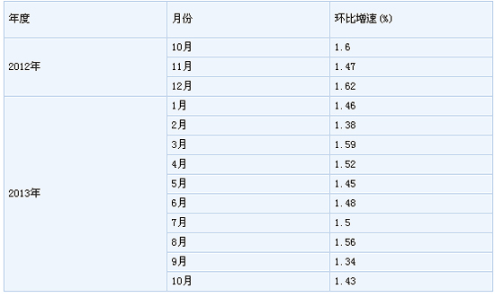 根據季節(jié)調整模型自動修正程序,對2012年10月份以來的固定資產投資(不含農戶)環(huán)比增速進行修訂。修訂結果及2013年10月份環(huán)比數據如下: