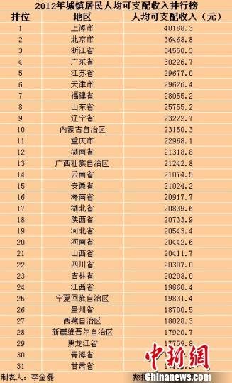 結(jié)果顯示,上海、北京、浙江這3個(gè)地區(qū)位列前三名。其中,上海2012年城鎮(zhèn)居民人均可支配收入最高,達(dá)到了40188.3元。北京排名第二,為36468.8元;浙江排名第三,為34550.3元。