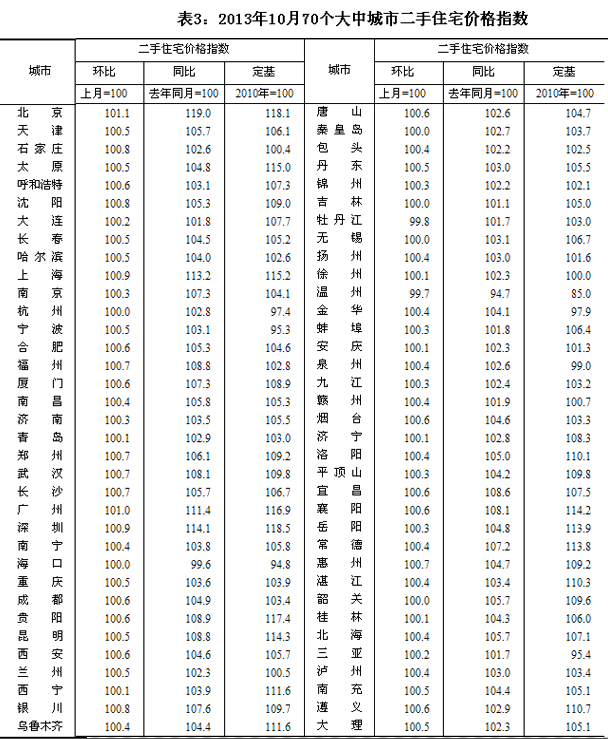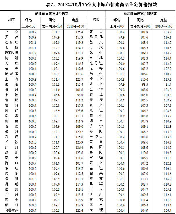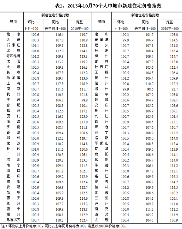 國家統(tǒng)計局18日發(fā)布2013年10月份70個大中城市住宅銷售價格變動情況顯示,與上月相比,70個大中城市中,新建商品住宅(不含保障性住房)價格下降的城市有2個,持平的城市有3個,上漲的城市有65個。環(huán)比價格變動中,最高漲幅為1.3%,最低為下降0.1%。