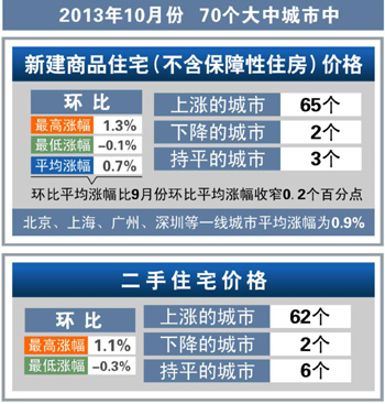 北京、上海、廣州、深圳等一線城市新建商品住宅價格環(huán)比平均漲幅為0.9%,較9月份收窄0.5個百分點。天津等33個二、三線城市的新建商品住宅價格環(huán)比漲幅較9月也有不同程度的下降。從環(huán)比最高漲幅比較看,70個大中城市中,10月份新建商品住宅價格環(huán)比最高漲幅為1.3%,比9月份的環(huán)比最高漲幅收窄0.6個百分點。