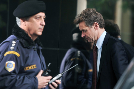 國際貨幣基金組織(IMF)希臘紓困項目負責人波爾·湯姆森(右)18日從位于雅典的希臘財政部內(nèi)走出。當日,希臘財長斯圖納拉斯會見了“三駕馬車”(歐盟、IMF以及歐洲央行)的代表,就未來一年希臘的財政預算交流了看法。斯圖納拉斯表示,目前希臘方面與“三駕馬車”,就2014年財政預算是否存在還需要進一步救助資金填補的缺口一事,尚未達成一致意見,但“最終會有一個解決辦法”。據(jù)悉,希臘政府將于21日提交2014年預算案。