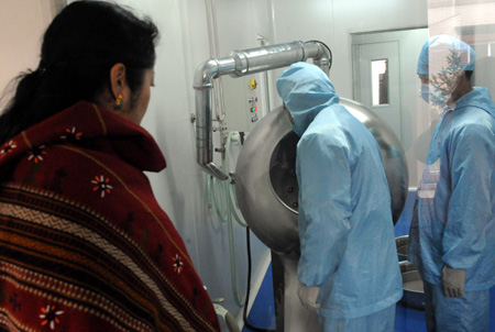 專家學(xué)者、宗教界人士和醫(yī)護人員代表日前齊聚一堂,共同慶祝北京藏醫(yī)院成立20周年,并參觀北京藏醫(yī)院新設(shè)立在北京市昌平區(qū)南口鎮(zhèn)的藏藥研究和加工機構(gòu)。目前,北京藏醫(yī)院制作了500余種藏藥材標(biāo)本,根據(jù)國家要求開始制定藏藥標(biāo)準,旨在為藏醫(yī)藥發(fā)展打下堅實的基礎(chǔ)。圖為與會者在參觀北京藏醫(yī)院南口基地的藏藥生產(chǎn)。