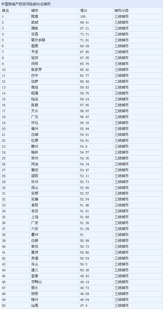 易居(中國)控股有限公司執(zhí)行總裁丁祖昱對記者分析,風(fēng)險排在前50位的基本上都是三線城市,有個別二線城市。在發(fā)展前景前50位的城市當(dāng)中,以一二線城市為主,三線城市的數(shù)量比較少,即使有,也是東部較發(fā)達(dá)的一些地級市。