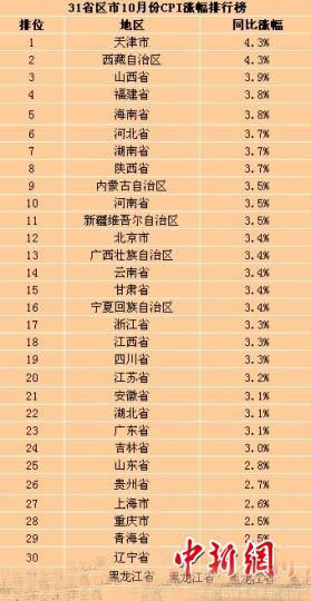 在31個省區(qū)市中,天津和西藏10月份CPI同比漲幅最高,均為4.3%,也是僅有的兩個突破4%的地區(qū)。