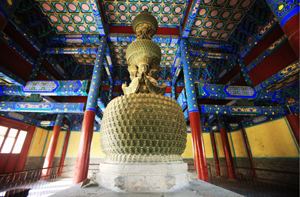 中國(guó)古代最精美的銅鑄毗盧佛 毗盧殿位于隆興寺中軸線最末端,殿內(nèi)的毗盧佛堪稱國(guó)寶,毗盧佛設(shè)計(jì)獨(dú)特,精美絕倫,為明萬(wàn)歷皇帝朱翊鈞為其生母慈圣皇太后祝壽所御制的。這尊毗盧佛全部為青銅鑄造,高6.72米,由三層坐式毗盧佛和三層圓鼓形蓮座層置而成。三層蓮座的千葉蓮瓣上均鑄有一坐式小佛,表情、手印富于變化,整尊造像上共計(jì)大小佛像1072尊。這尊皇家御制的毗盧佛真實(shí)地反映了當(dāng)時(shí)的銅鑄工藝,據(jù)有極高的歷史、科學(xué)、藝術(shù)價(jià)值,堪稱海內(nèi)孤例。