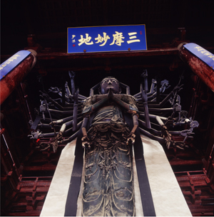 最高大、最古老的千手千眼觀音 大悲閣是隆興寺的主體建筑,閣內(nèi)供奉聞名遐邇的宋代銅鑄“千手千眼觀音菩薩”,俗稱“正定府大菩薩”。它為北宋開(kāi)寶四年(971)奉太祖趙匡胤之命鑄造。像高21.3米,共42臂,除本身的兩只手、眼外,在身體左右各有20只手,分別執(zhí)日、月、凈瓶、金剛杵、寶劍等法器。銅像身軀高大,比例適度,其形體之巨、雕工之細(xì)實(shí)為罕見(jiàn),是世界上古代銅鑄佛像中最高大、最古老的千手千眼觀世音菩薩像。