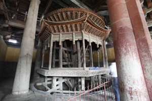 最古老的轉(zhuǎn)輪藏 轉(zhuǎn)輪藏直徑七米,是一座收藏經(jīng)文的旋轉(zhuǎn)書(shū)架,外觀形似八角形亭子,中設(shè)木軸,亭身設(shè)有經(jīng)屜,可以存放佛經(jīng),推之可轉(zhuǎn)動(dòng)。取佛教“法輪常轉(zhuǎn),自動(dòng)不息”之意,喻佛法猶如輪子輾轉(zhuǎn)相傳,永不停息。佛教中亦有推其旋轉(zhuǎn)與誦讀經(jīng)文同功之說(shuō)。這種建筑形制國(guó)內(nèi)保存下來(lái)的甚少,主要有四川平武報(bào)恩寺華嚴(yán)店和北京智化寺藏殿的明代轉(zhuǎn)輪藏、北京頤和園萬(wàn)壽山和山西五臺(tái)山塔院寺大藏經(jīng)閣清代轉(zhuǎn)輪藏、正定隆興寺轉(zhuǎn)輪藏閣內(nèi)的宋代轉(zhuǎn)輪藏,因此稱其是中國(guó)現(xiàn)存最早的轉(zhuǎn)輪藏。
