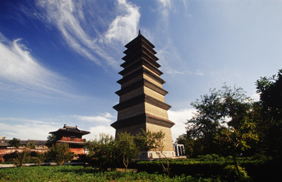 凌霄塔位于正定天寧寺內(nèi),因其以木構(gòu)為主而俗稱木塔。始建于唐代宗年間(762-779年),宋、金均有重修。塔平面呈八角形,為九級(jí)磚木混合結(jié)構(gòu)的閣樓式塔,高40.98米,可供人登臨。其精妙之處是于塔心室四層以上保留著對(duì)穩(wěn)定塔身極為有利的塔心柱結(jié)構(gòu),這種形式為全國(guó)孤例。