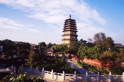 華塔原名多寶塔,始建于唐,高33.35米,矗立在廣惠寺內(nèi)。華塔由主塔和四小塔組成,主塔底層四隅各附建一座扁六邊形亭狀小塔,小塔環(huán)抱主塔,高低錯(cuò)落,主次相依,精巧華麗,壯觀秀逸。其奇特的平面布局是全國(guó)現(xiàn)存為數(shù)不多的其他花塔所不能比擬的,堪稱我國(guó)絕無(wú)僅有的稀世珍寶。