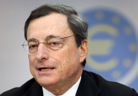歐洲央行12月5日宣布將主要再融資利率維持在0.25%的歷史低點。歐洲央行還將明年的通脹預(yù)期由1.3%下調(diào)至1.1%,顯示出歐元區(qū)經(jīng)濟復(fù)蘇形勢依然脆弱;并將明年的經(jīng)濟增長預(yù)期由1%上調(diào)至1.1%。歐洲央行行長德拉吉表示,未來將繼續(xù)維持低利率政策,但未提出任何額外的寬松措施。圖為德拉吉當(dāng)天在新聞發(fā)布會上發(fā)言。