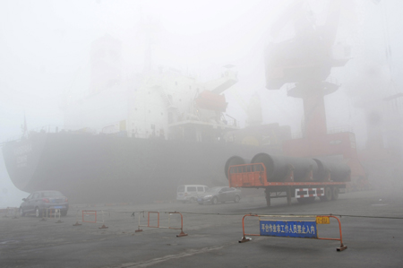 據(jù)中國氣象局網(wǎng)站消息,8日早晨,我國受霧霾天氣影響范圍較大,河北中南部、北京南部、山東中西部、河南中東部、江蘇、安徽、上海等地均出現(xiàn)能見度不足1000米的大霧。8日上午,青島地區(qū)大霧使部分地區(qū)能見度不足10米。截至9時,機場已有55架次航班延誤或取消。南京市氣象臺8日7時15分將大霧橙色預(yù)警升級為紅色。當(dāng)?shù)馗咚偃糠饴贰C場“停擺”。 圖為,當(dāng)日一艘大型遠洋運輸輪停泊在連云港港口碼頭等待霧散裝運出口貨物。