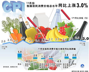 國(guó)家統(tǒng)計(jì)局9日公布,11月居民消費(fèi)價(jià)格總水平(CPI)同比上漲3.0%,漲幅較10月回落0.2個(gè)百分點(diǎn),低于此前3.2%的市場(chǎng)普遍預(yù)期,近3個(gè)月來(lái)首次漲勢(shì)放緩。
