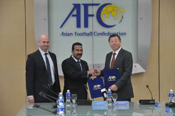 青島啤酒副總裁兼營(yíng)銷總裁王瑞永代表青啤與亞足聯(lián)秘書(shū)長(zhǎng)亞歷克斯簽約。 |