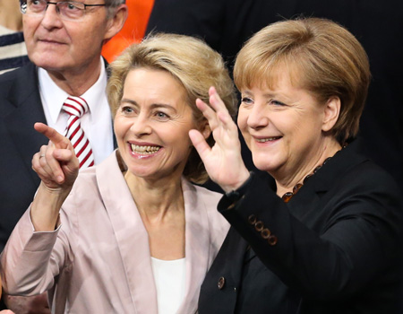 12月17日,在德國(guó)柏林國(guó)會(huì)大廈,默克爾(右)與新任國(guó)防部長(zhǎng)烏爾蘇拉·馮德萊恩出席會(huì)議。德國(guó)聯(lián)邦議院當(dāng)天舉行總理選舉投票表決,默克爾再次連任新一屆聯(lián)邦政府總理。