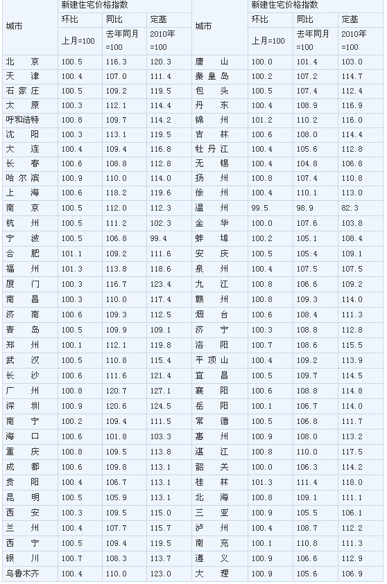 注:環(huán)比以上月價格為100,同比以去年同月價格為100,定基以2010年價格為100。