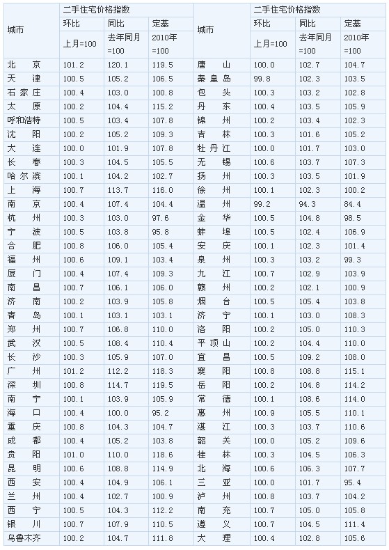 表3:2013年11月70個大中城市二手住宅價格指數(shù)