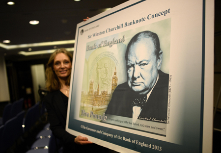 12月18日,在倫敦的英國中央銀行,英國央行員工展示印有丘吉爾頭像的5英鎊塑料貨幣反面的設(shè)計圖樣。 當(dāng)日,英國中央銀行公布向公眾征求意見結(jié)果,正式宣布發(fā)行塑料貨幣。央行計劃在2016年首先發(fā)行5英鎊塑料貨幣,之后發(fā)行10英鎊塑料貨幣。塑料貨幣將比現(xiàn)在的紙幣小一些,更方便使用者放在錢包中。