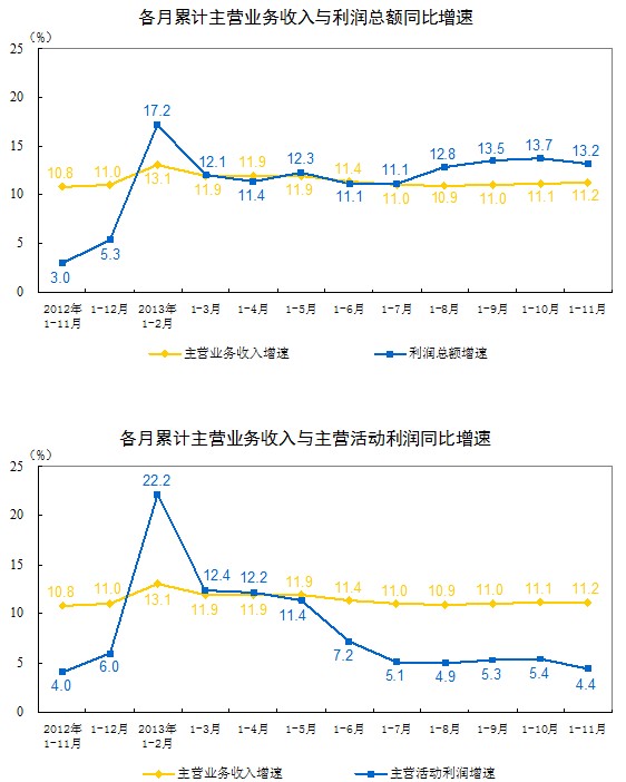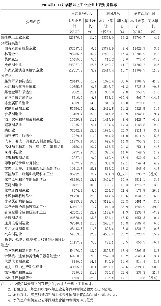 1-11月份,全國規(guī)模以上工業(yè)企業(yè)實現(xiàn)利潤總額53338億元,比去年同期增長13.2%,增速比1-10月份回落0.5個百分點(diǎn),其中,主營活動利潤[1]53700.7億元,比去年同期增長4.4%,增速比1-10月份回落1個百分點(diǎn)。