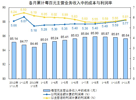 1-11月份,規(guī)模以上工業(yè)企業(yè)實現(xiàn)主營業(yè)務(wù)收入923876.6億元,比去年同期增長11.2%。每百元主營業(yè)務(wù)收入中的成本為85.64元,以利潤總額計算的利潤率為5.77%,以主營活動利潤計算的利潤率為5.81%。