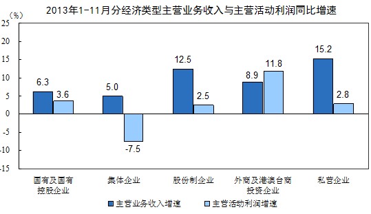 1-11月份,在規(guī)模以上工業(yè)企業(yè)中,國有及國有控股企業(yè)實現(xiàn)利潤總額13779.9億元,比去年同期增長8.4%,其中,主營活動利潤11625.3億元,增長3.6%;集體企業(yè)實現(xiàn)利潤總額716.2億元,基本持平,其中,主營活動利潤774億元,下降7.5%;股份制企業(yè)實現(xiàn)利潤總額31249.7億元,增長11.7%,其中,主營活動利潤31702.7億元,增長2.5%;外商及港澳臺商投資企業(yè)實現(xiàn)利潤總額12417.4億元,增長15.7%,其中,主營活動利潤11909.5億元,增長11.8%;私營企業(yè)實現(xiàn)利潤總額17400.7億元,增長16.3%,其中,主營活動利潤19706.9億元,增長2.8%。