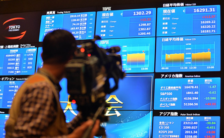 圖為當(dāng)日一名攝像師在東京證券交易所拍攝電子屏幕。