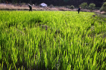 工人在藥材種植基地藏菖蒲試驗田里工作 |