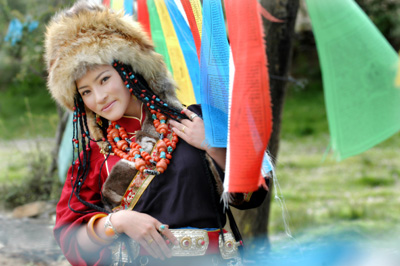 工布藏族常常頭頂華麗的狐貍帽和氈帽,身著羊絨織就、綢緞鑲邊、獸皮加工而成的氆氌,腰間喜掛藏刀,腳蹬藏靴,富貴華麗,雍容大方。