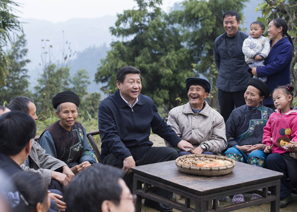 2013年11月3日至5日,中共中央總書記、國(guó)家主席、中央軍委主席習(xí)近平在湖南考察。這是3日下午,習(xí)近平在湘西土家族苗族自治州花垣縣排碧鄉(xiāng)十八洞村同村干部和村民座談。新華社記者 王曄 攝