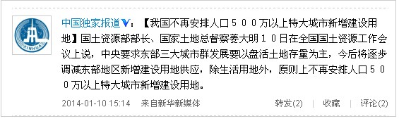 據(jù)新華社對(duì)外部中國(guó)獨(dú)家報(bào)道微博1月10日消息,國(guó)土資源部部長(zhǎng)、國(guó)家土地總督察姜大明10日在全國(guó)國(guó)土資源工作會(huì)議上說(shuō),中央要求東部三大城市群發(fā)展要以盤(pán)活土地存量為主,今后將逐步調(diào)減東部地區(qū)新增建設(shè)用地供應(yīng),除生活用地外,原則上不再安排人口500萬(wàn)以上特大城市新增建設(shè)用地。